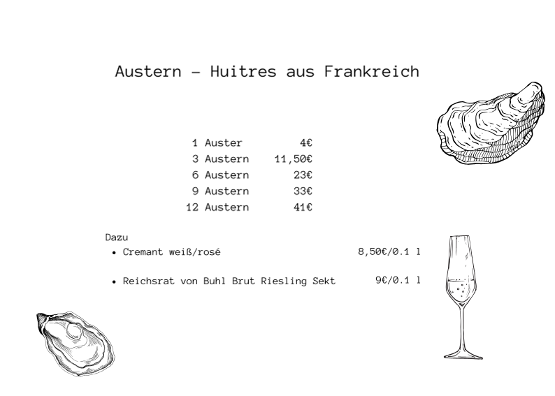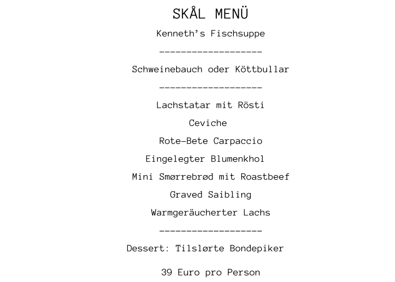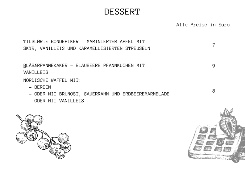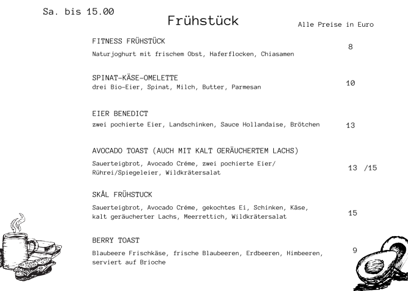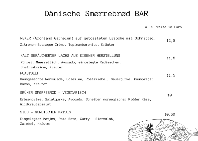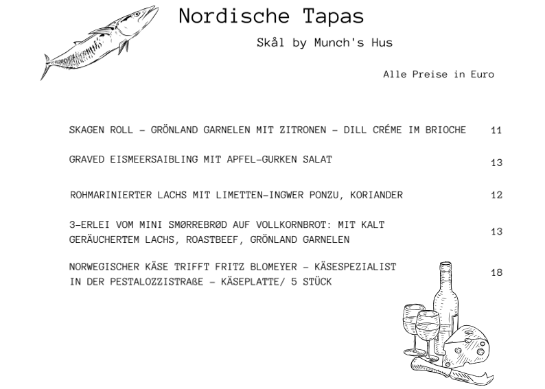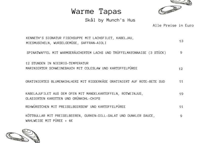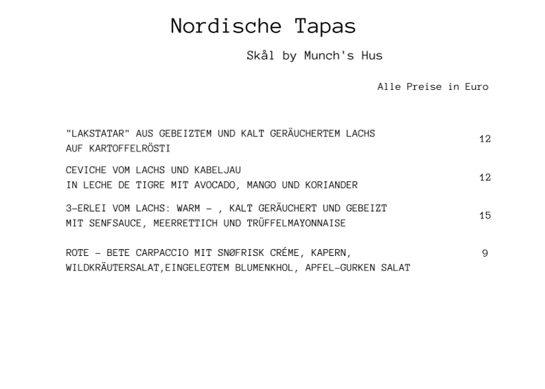 Skål - Nordic Tapas in Berlin offers a diverse and enticing menu that combines Nordic flavors with contemporary twists. The cocktails, such as the refreshing Nordic Summer, Skål Negroni, and the fruity Heidelbeer Mojito, set the stage for a delightful dining experience. For those who appreciate seafood, the selection of Oysters (available in various quantities from 1 to 12 pieces) and Danish Smørrebrød options like Reker (Greenland shrimp) and Kalt Geräucherter Lachs (cold-smoked salmon) are standouts. The Nordic Tapas menu includes flavorful dishes such as Lachs Tatar (salmon tartare), Ceviche vom Lachs und Kabeljau (salmon and cod ceviche), and the beautifully presented Rote Bete Carpaccio (beetroot carpaccio). For a more substantial meal, the Warme Tapas include Kenneth’s Signatur Fischsuppe (fish soup), Spinatwaffel (spinach waffle), and Kabeljaufilet aus dem Ofen (oven-baked cod). The Skål Menü, featuring a combination of fish soup, pork belly, salmon tartare with rösti, and ceviche, offers a perfect sampling of the restaurant's Nordic-inspired delights. For dessert, guests can indulge in treats like Tilslørte Bondepiker or Blåbærpannekaker (blueberry pancakes). The breakfast options, such as the Fitness Frühstück and Eggs Benedict, are ideal for starting the day with a hearty meal. To complement the dishes, the drink menu features a variety of wines and sparkling options, including Reichsrat von Buhl Brut Riesling Sekt. Overall, Skål’s menu showcases a delightful fusion of Nordic ingredients and innovative cooking techniques, making it a must-visit for anyone seeking a unique culinary experience in Berlin.